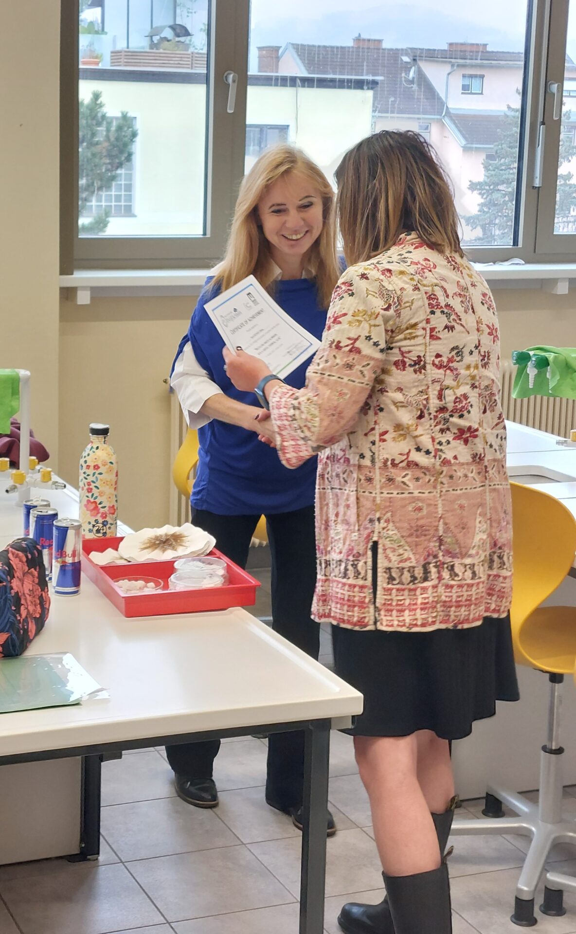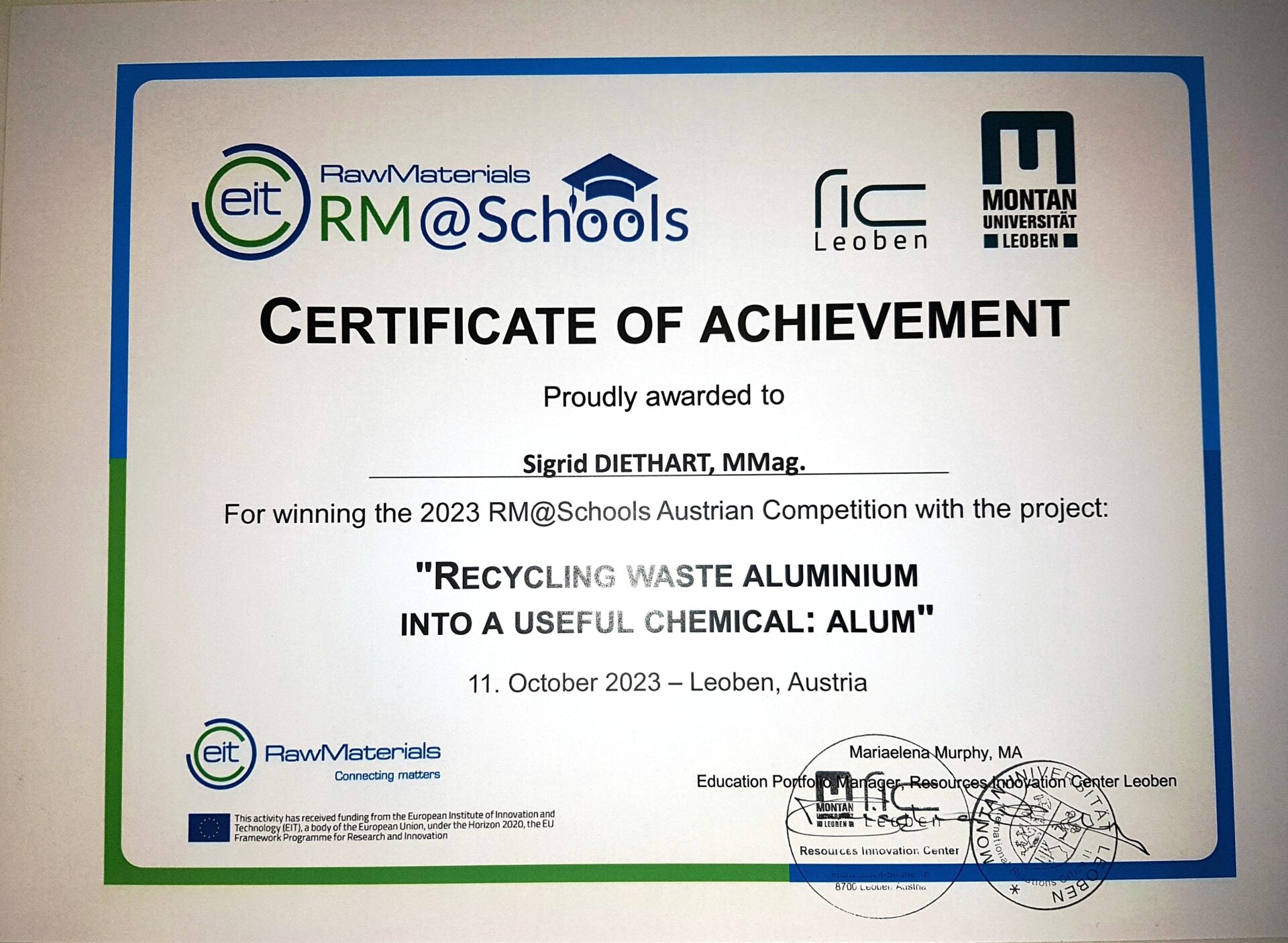 Die Freude der Chemielabor-Gruppe des Europagymnasiums war riesengroß, als ihr eingereichtes Projektvideo beim RM@Schools-Wettbewerbs des RIC-Leoben (Resources Innovation Center) der Montanuniversität als Siegerprojekt durch die Projektmanagerinnen Mariaelena Murphy sowie Anja Vujakovic verkündet wurde.